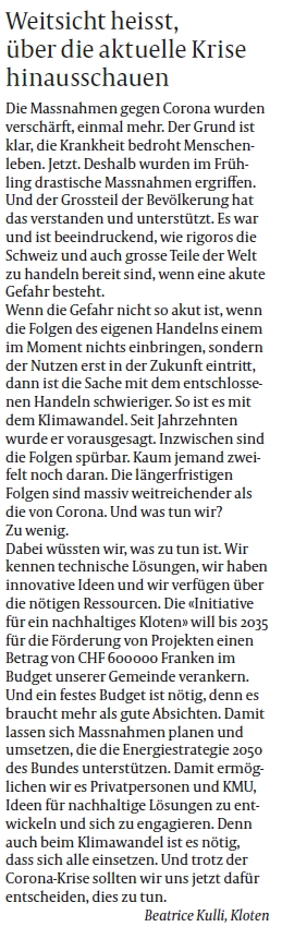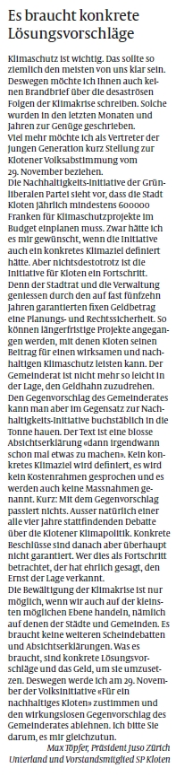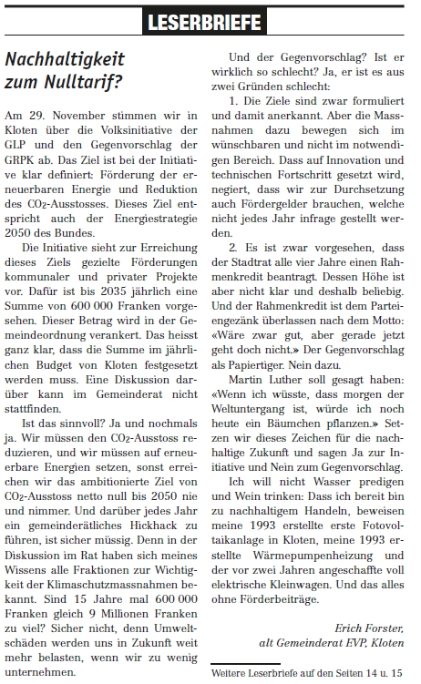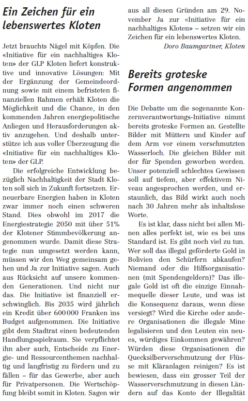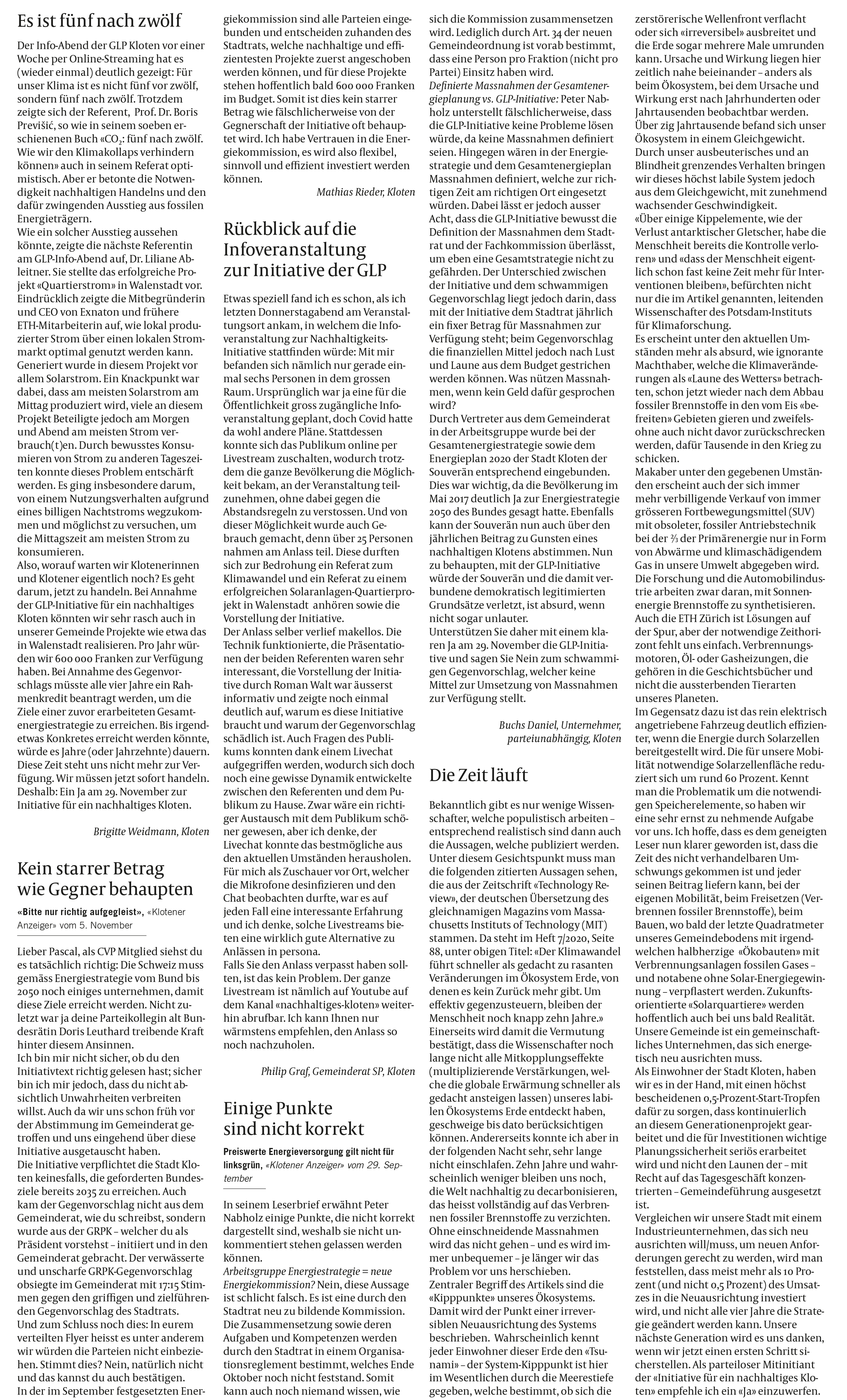 In einer Woche ist es soweit und wir stimmen über unsere Initiative ab. Die lokalen Zeitungen wie der Klotener Anzeiger (KA) oder Zürcher Unterländer (ZU) lassen in der kommenden Woche keine neuen Beiträge und Leserbriefe mehr zu, weshalb wir hier nun eine (wohl nicht ganz vollständige) Übersicht aller Berichte und Leserbriefe der letzten Woche zusammenstellen. Sollten Sie sich noch nicht für unsere Initiative entschieden haben – nach dem Lesen der Berichte und Leserbriefe werden Sie es bestimmt!