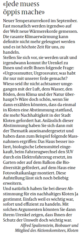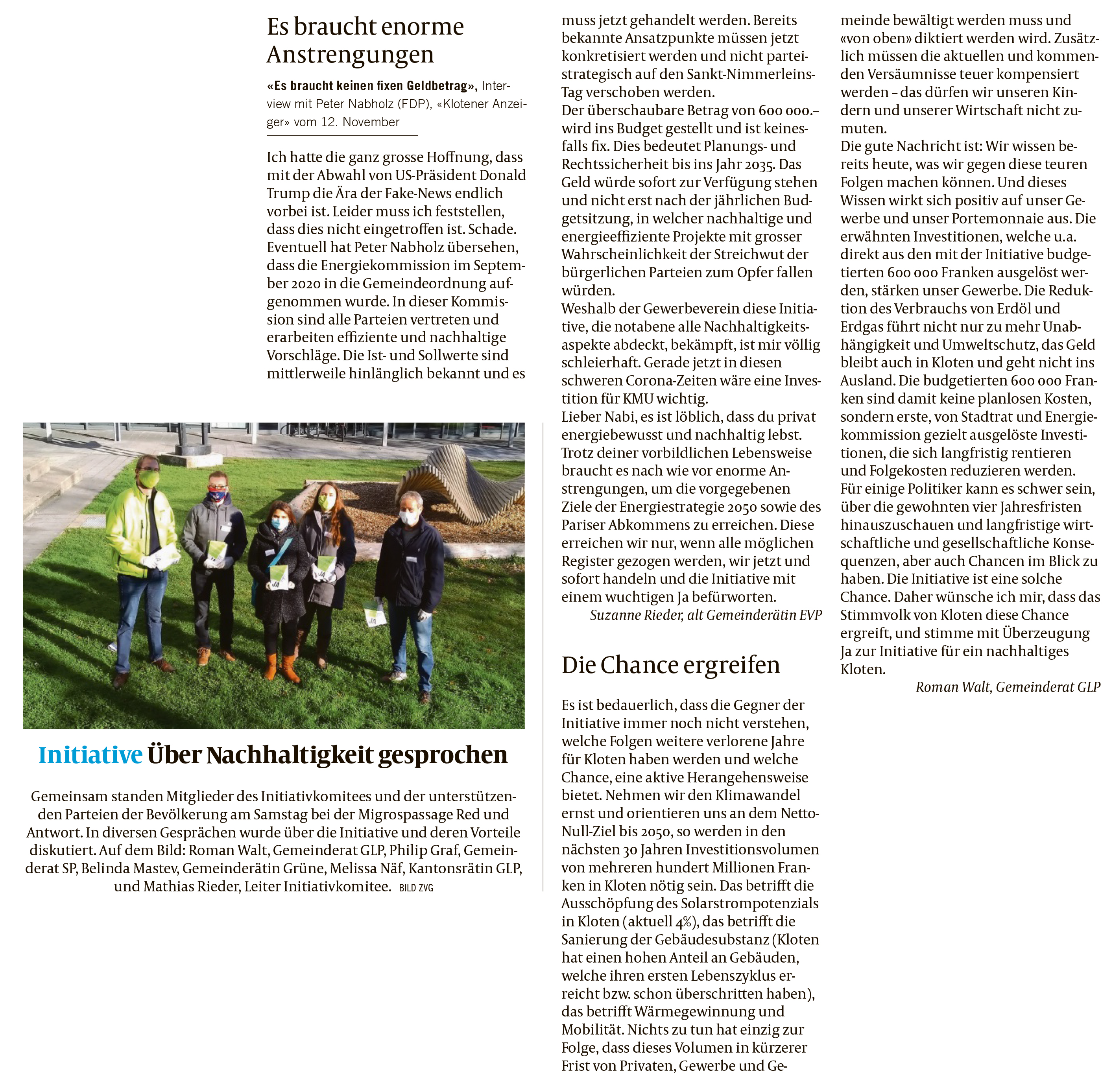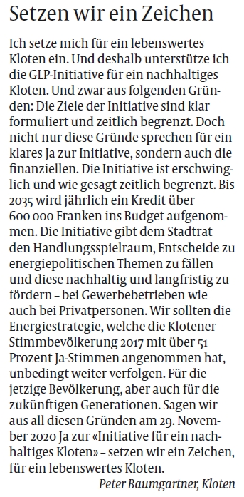 Wir danken bereits an dieser Stelle allen Unterstützerinnen und Unterstützern für das riesige Engagement! Gemeinsam für ein nachhaltiges Kloten!