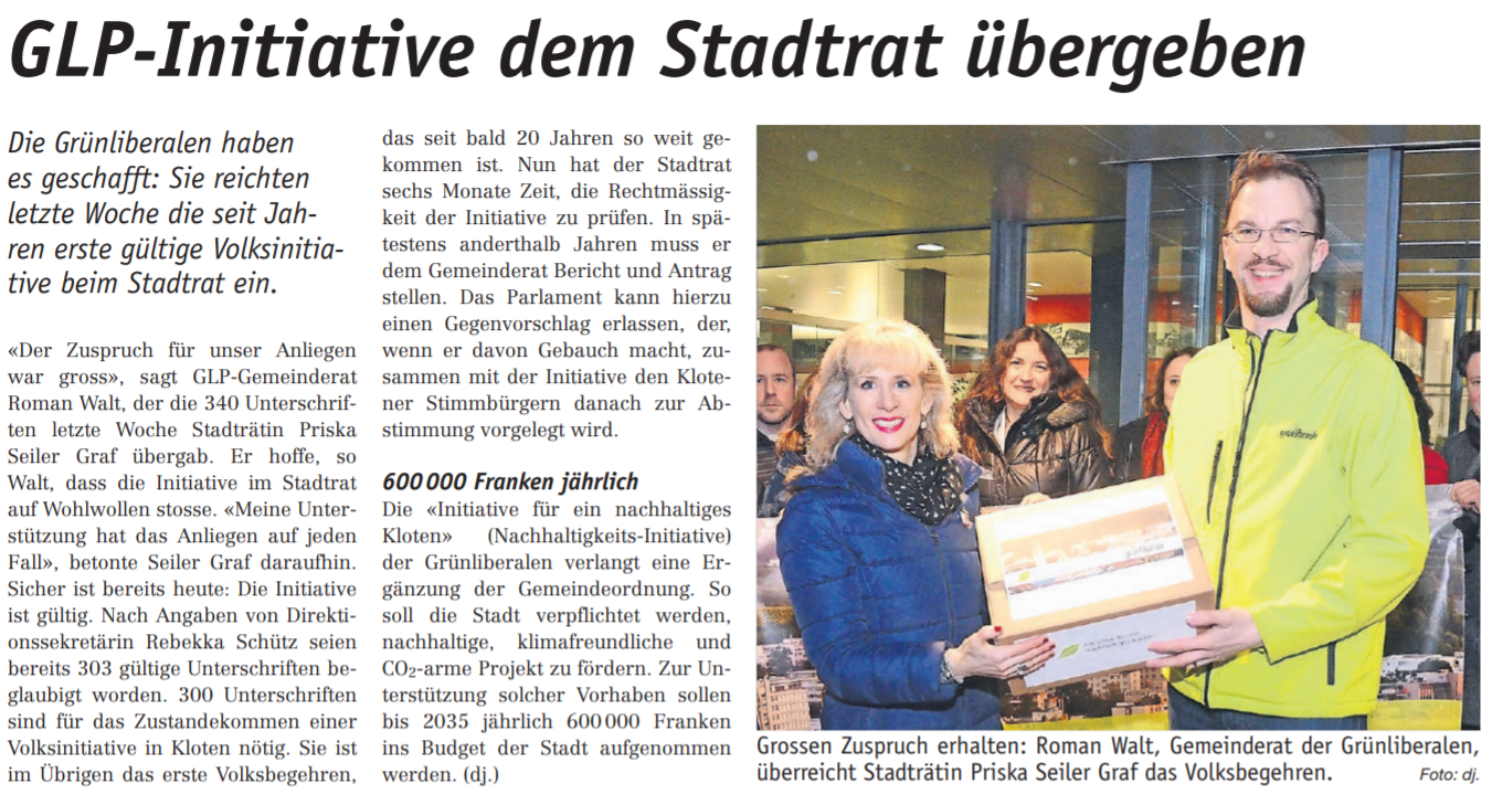 • Am 15. April sind in Kloten Wahlen. Unterstützen Sie die Trägerpartei der Initiative, die glp und Politiker-/Innen aus dem Initiativ- und Unterstützungskomitee, um die Idee der Initiative auch im Gemeinderat stärker zu verankern!