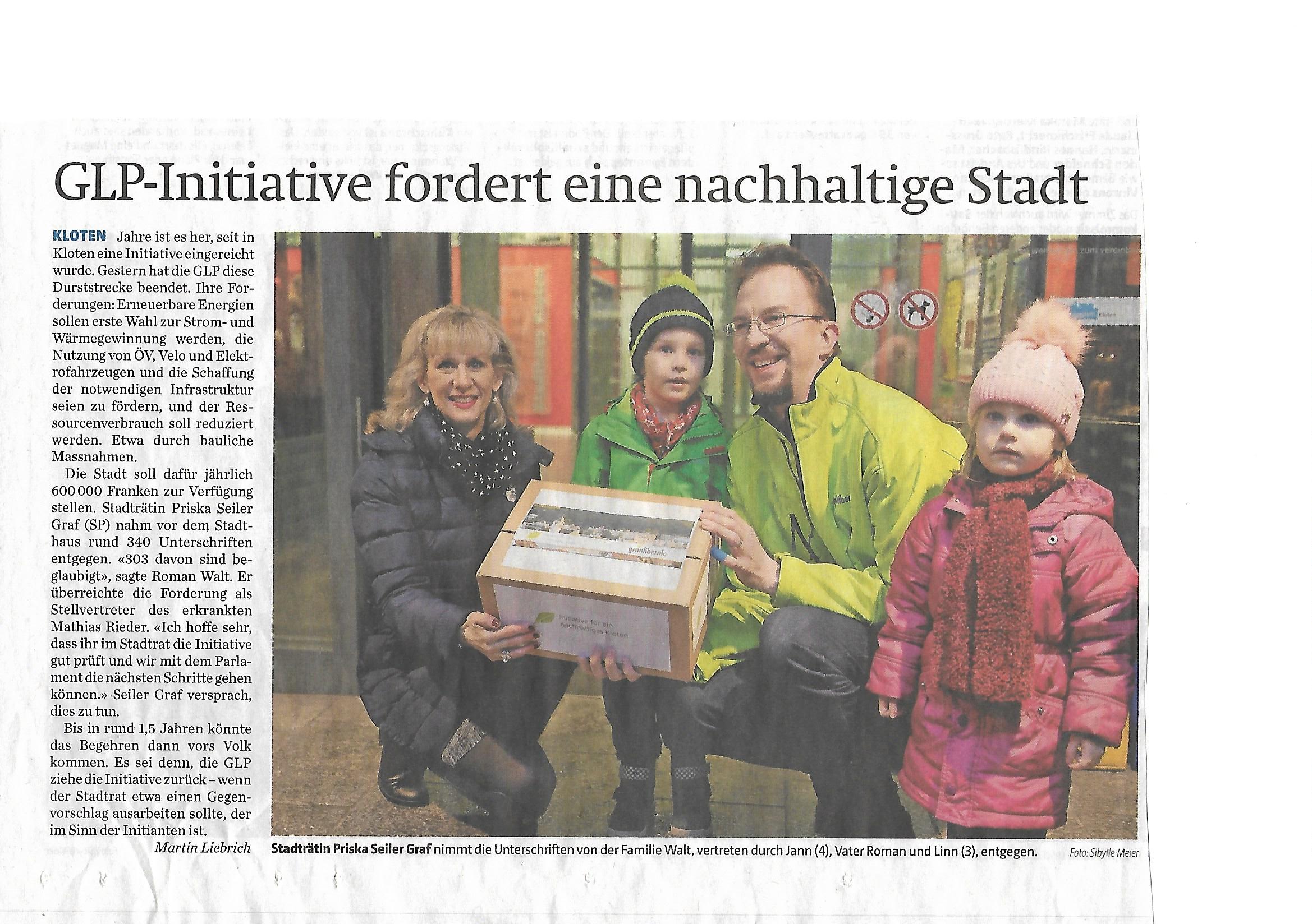 Vor einem Monat konnten wir unsere Initiative der zuständigen Stadträtin Priska Seiler Graf übergeben. Beim anschliessenden Apéro wurde noch intensiv diskutiert und auf den Erfolg angestossen: Nach 20 Jahren ist in Kloten erstmals wieder einmal eine Volksinitiative so weit gekommen!! (Klotener Anzeiger, 22. Februar 2018).