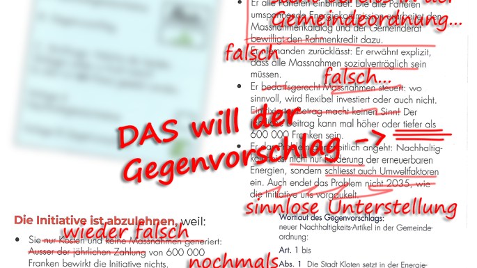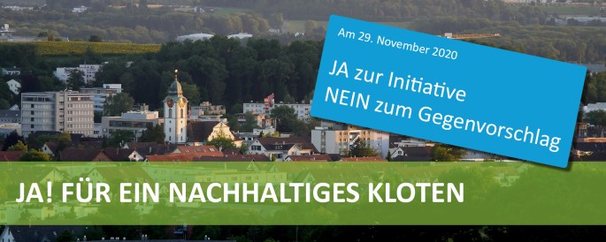 Unsere Initiative ist klar, fokussiert und leistet ihren Beitrag zu langfristig planbaren Massnahmen im Bereich erneuerbaren Energien und Ressourceneffizienz. Der schädliche Gegenvorschlag verhindert ein weiteres Mal konkrete und nötige Schritte. Schreiben wir diese ersten, wirksamen Schritte für die nächsten Jahre in die Gemeindeordnung und sagen am 29. November gemeinsam JA zur Initiative für ein nachhaltiges Kloten!