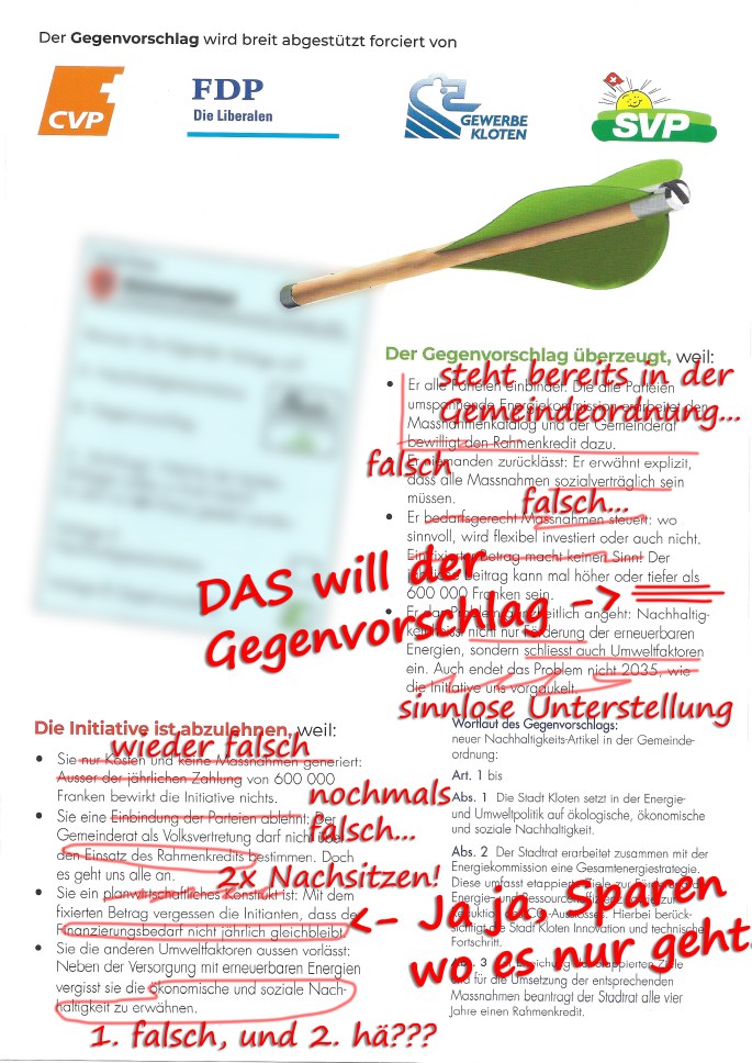 Letzte Woche haben alle Haushalte in Kloten den Flyer unserer „Gegner“ erhalten. Die lokalen Sektionen der SVP, FDP und CVP mit Unterstützung des lokalen Gewerbevereins versuchen mit 8 Behauptungen, die Vorteile des Gegenvorschlags zu bewerben und die Initiative schlecht zu machen.